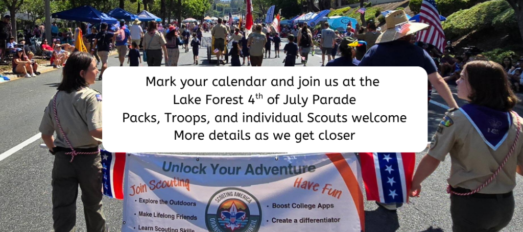 Mark your calendar and join us at the Lake Forest 4th of July Parade. Packs, Troops, and individual Scouts welcome.